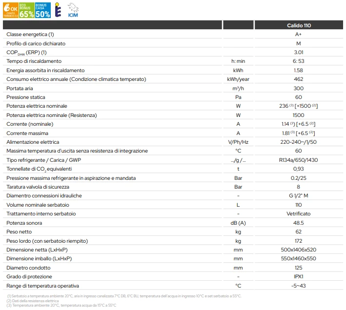 Con il gas refrigerante ecologico R134A e una valvola di espansione elettronica, il Calido 110 offre prestazioni eccellenti anche con temperature esterne che variano da -5°C a +43°C, migliorando l'efficienza e rendendolo conforme al conto termico. Il ridotto assorbimento elettrico, abbinato all'alta efficienza dei compressori e scambiatori, permette al dispositivo di appartenere alla classe energetica A, assicurando un notevole risparmio energetico.